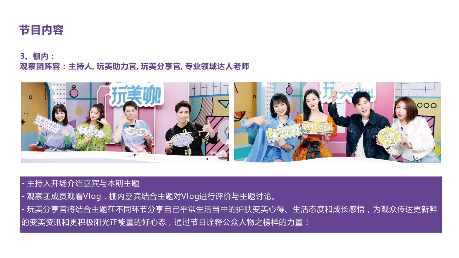 《OMG玩美咖》節(jié)目以亞洲女性為主力觀眾群體,擯棄演播室中傳統(tǒng)、枯燥的說教模式,將節(jié)目形式設(shè)定為純外景體驗式。采取時下最熱門的明星生活秀模式,明星閨蜜團在聚會般的輕松氛圍下分享和推薦,涵蓋都市潮流生活的方方面面,賦予觀眾切身時尚生活體驗。