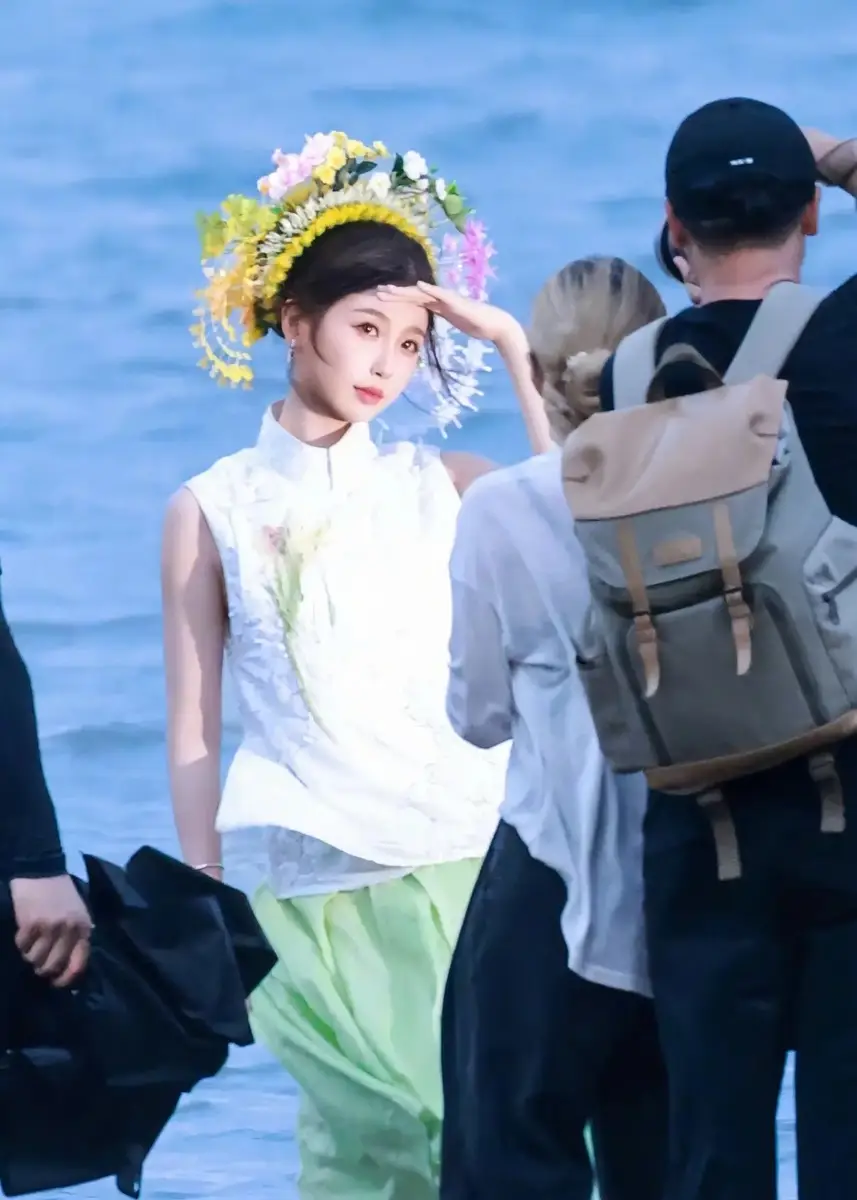 7月4日,虞書欣在拍攝新劇時的一組路透曝光,照片里的她穿新中式白色上衣搭配綠色裙子,清新自然,海邊簪花明媚嬌艷。