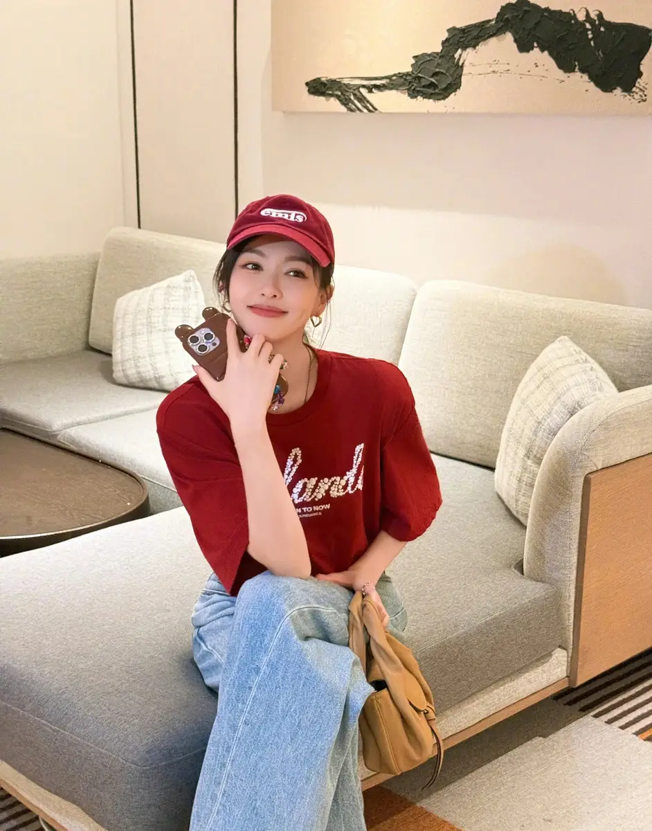 41歲唐嫣穿紅色T恤打扮時(shí)髦 嘟嘴賣萌甜笑狀態(tài)似少女