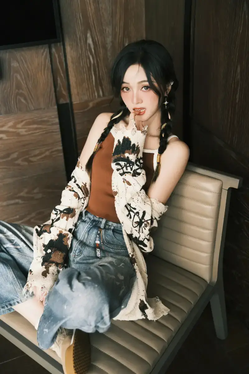 吳宣儀穿棕色吊帶嘟嘴賣萌可愛十足 搭配麻花辮造型鬼馬俏皮