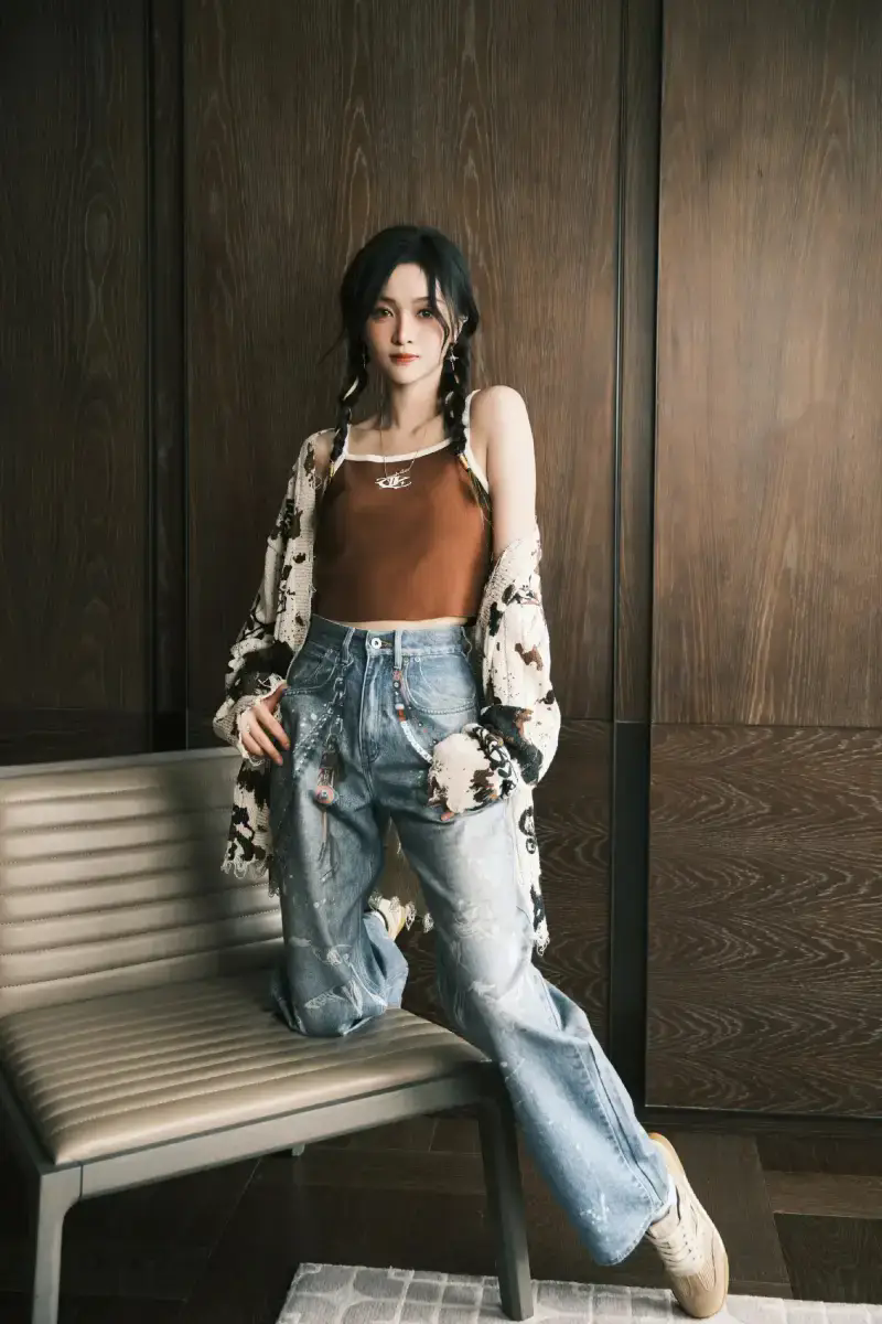 吳宣儀穿棕色吊帶性感迷人。