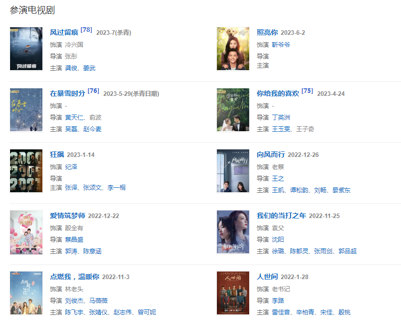 202215日,參演的都市家庭情感劇《完美伴侶》播出;128日,參演的現(xiàn)實主義題材大劇《人世間》播出。