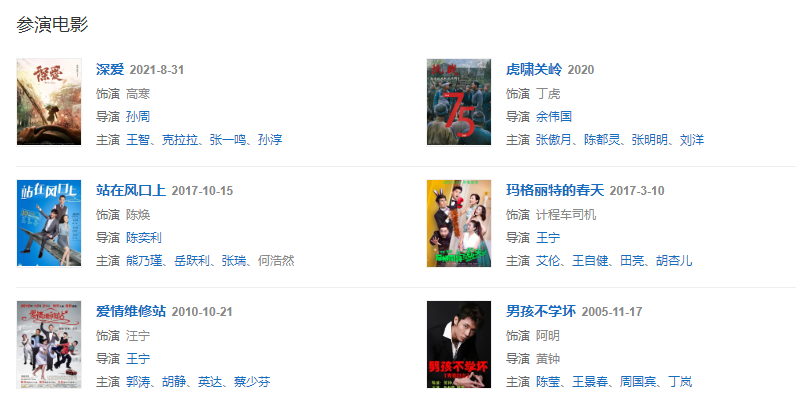 2021年,參加黑龍江衛(wèi)視的戶外冰雪體驗競技類真人秀節(jié)目《沸騰吧!冰雪》第二站;813日,主演的電影《深愛》上映;915日,特別主演的當代農村劇《在希望的田野上》開播 。