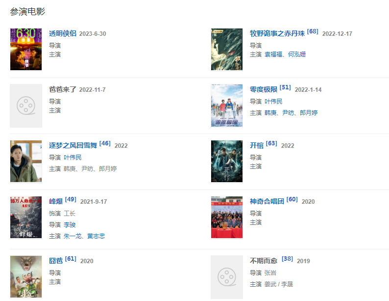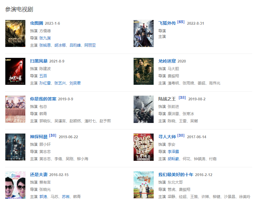 202041日,參演的電視劇《龍嶺迷窟》播出,在劇中飾演馬大膽。