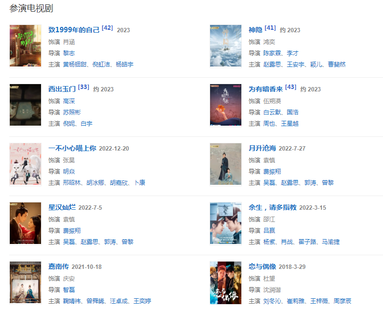 代表作品嘉南傳、戀與偶像、同顏小姐、創(chuàng)造營2019、封神三部曲、超越、星漢燦爛 、只要你過得比我好 、余生,請多指教