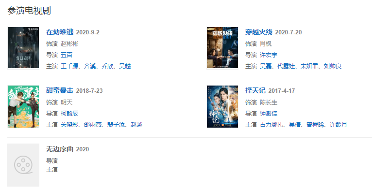 2020年,擔(dān)任騰訊視頻綜藝節(jié)目《創(chuàng)造營2020》教練成員;92日,主演的輕科幻懸疑劇《在劫難逃》播出 ;11月,擔(dān)任綜藝節(jié)目《哈哈哈哈哈》旅行社成員。