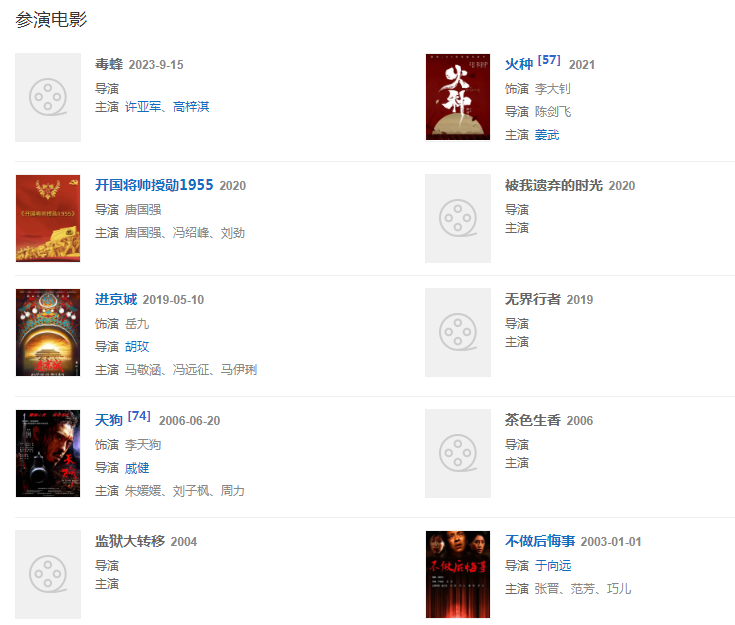 代表作品:天狗、戰(zhàn)爭子午線、紫日、隋唐演義、神探狄仁杰前傳、大秦帝國之縱橫、進(jìn)京城、歸鴻