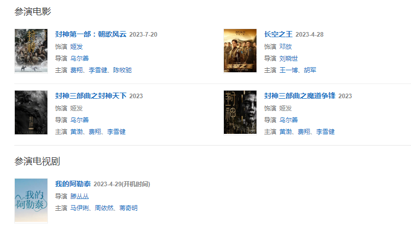 代表作品:封神三部曲、長空之王、封神第一部:朝歌風云、我的阿勒泰
