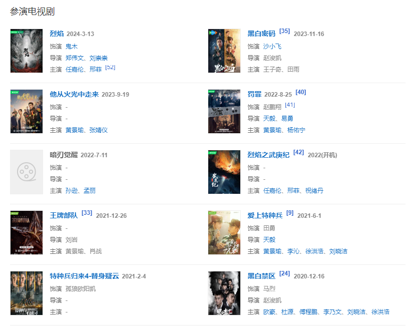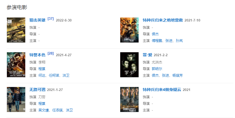 2010年開始相繼參演劉猛執(zhí)導(dǎo)的軍旅劇《我是特種兵》、《我是特種兵之利刃出鞘》和《特種兵之火鳳凰》,為觀眾所熟知。