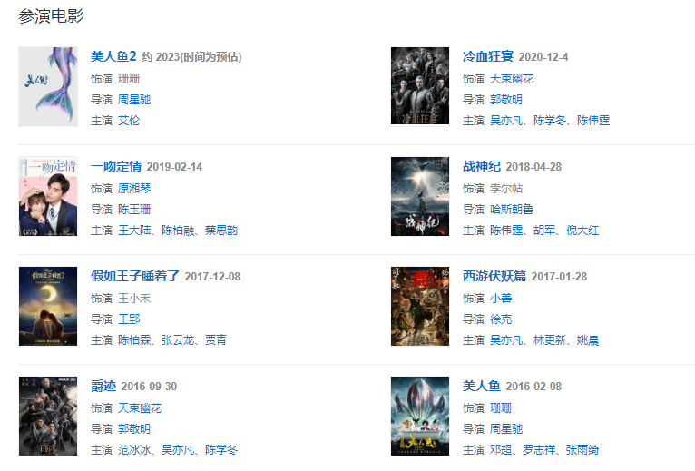 代表作品:美人魚、爵跡、西游伏妖篇、斗破蒼穹、彼岸花、光陰里的故事