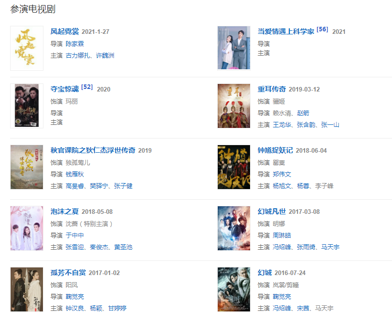 2021127日,特別出演的古裝愛情勵志劇《風起霓裳》開播;212日,在《2021年北京廣播電視臺春節(jié)聯(lián)歡晚會》上與姜潮表演節(jié)目《給我一個吻》;參演電視劇《當愛情遇上科學家》。