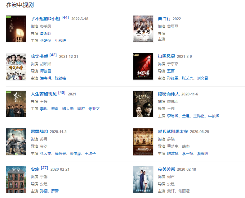 20222022318日,參演的諜戰(zhàn)網(wǎng)劇《了不起的D小姐》播出,在劇中飾演秦美鳳。