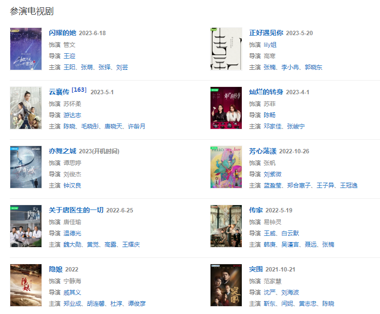 代表作品:還珠格格第三部:天上人間、又見一簾幽夢(mèng)、延禧攻略、怪你過分美麗、大唐女將樊梨花、深宅、一肩之隔、繡娘蘭馨、母語(yǔ)、王的盛宴