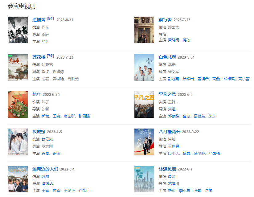 2022128日,參演的現(xiàn)實(shí)主義題材大劇《人世間》播出,在劇中飾演平民女性于虹;3月,主演由潘鏡丞執(zhí)導(dǎo)的電視劇《大運(yùn)之河》;51日,參加由中華全國總工會和中央廣播電視總臺共同舉辦的《中國夢·勞動美——2022五一國際勞動節(jié)“心連心”特別節(jié)目》;525日,與高鑫主演的現(xiàn)實(shí)題材重點(diǎn)電視劇《春風(fēng)又綠江南岸》播出,在劇中飾演海歸女企業(yè)家蘇曉嵐;67日,主演的都市情感輕喜劇《林深見鹿》播出。20226月,主演的電視劇《蓮花樓》開機(jī)。