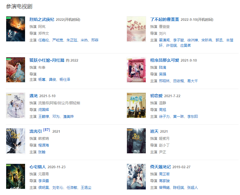 2019年,她主演的古裝武俠劇《倚天屠龍記》在騰訊視頻播出;同年,參加國內(nèi)首檔導(dǎo)演選角真人秀《演員請就位》。