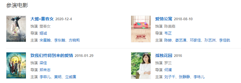 2016年1月29日,其參演個人首部電影《致我們終將到來的愛情》上映。同年,出演古裝探案喜劇《醫(yī)館笑傳2》,飾演醫(yī)館館主陳安安。