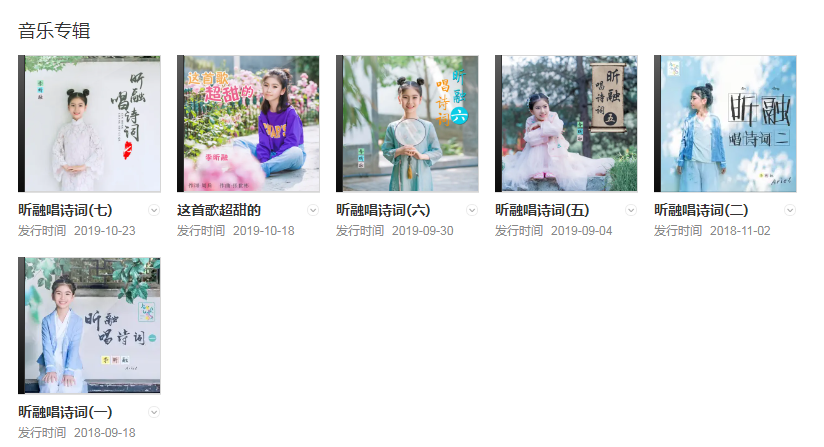 20181月,發(fā)行單曲《星星》《假如給我一雙翅膀》;3月,參與演唱動畫片《小河貍貝瓦》的插曲《萬能爸爸》;4月,發(fā)行單曲《小小少年》;6月,《3-6歲寶寶必聽故事集》出版發(fā)行;629日,參與錄制CCTV-3綜藝節(jié)目《綜藝盛典》,并與烏蘭圖雅合唱歌曲《美麗的草原我的家》]  ;8月,發(fā)行單曲《狗狗搖》;95日,使用曾用名“木子”參與錄制CCTV-3綜藝節(jié)目《天天把歌唱》,并與烏蘭圖雅合唱歌曲《明日歌》;10月,發(fā)行專輯《昕融唱詩詞(一)》;同月,發(fā)行單曲《昕融唱詩詞》《寶寶奇思妙想夢工廠》 ;11月,發(fā)行專輯《昕融唱詩詞(二)》。