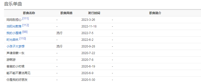 20221月,參演《春晚有心意——2021我要上春晚》。與空軍藍(lán)天幼兒藝術(shù)團(tuán)、李夢瀟、宋秉洋、鄧見超,聯(lián)唱兒時金曲。117日,發(fā)行單曲《蝸牛與黃鸝鳥》  126日,發(fā)行單曲《幸福派送》215日,發(fā)行單曲《北方有星辰》326日,發(fā)行單曲《魔法棒》。202262日發(fā)行單曲《時光森林》。202275日發(fā)行單曲《我的小圍裙》。