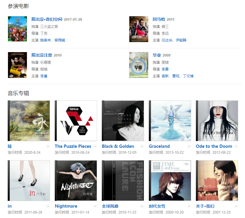 2010年,發(fā)行音樂(lè)專(zhuān)輯《全球風(fēng)靡》,憑該專(zhuān)輯獲得中國(guó)TOP排行榜年度最佳女歌手獎(jiǎng)。同年,主演動(dòng)物親善電影《熊出沒(méi)注意》,憑該片獲得優(yōu)酷影視盛典電影類(lèi)最佳新人獎(jiǎng) 。