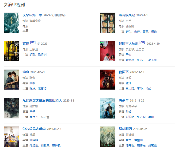 代表作品怒晴湘西、長江圖、繡春刀Ⅱ:修羅戰(zhàn)場、如懿傳、慶余年、帶著爸爸去留學(xué)、戀愛先生
