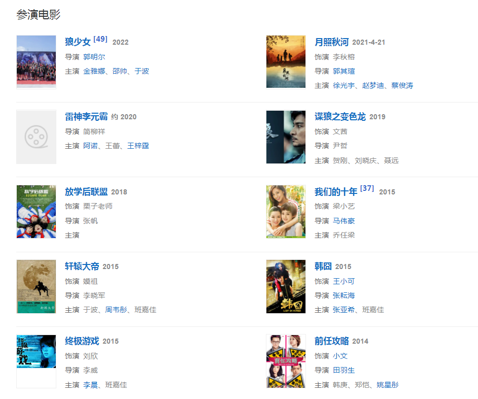 代表作品:前任攻略、我們的十年、脫軌時(shí)代、軒轅大帝、小城大愛、西藏秘密、瘋?cè)嗽骸⒈本┡訄D鑒