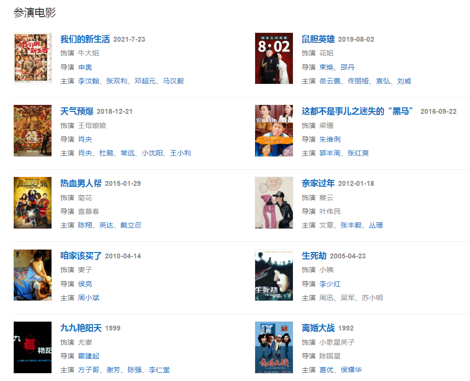 2000年在電視劇《閑人馬大姐》中飾演馬大姐,獲得《中國大眾電視》老百姓最喜愛影視明星等榮譽稱號。