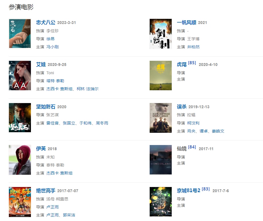 20213月,與馮小剛主演的電影《忠犬八公》定檔1231日上映,在片中飾演李佳珍;同年,主演由王學(xué)博執(zhí)導(dǎo)的電影《一帆風(fēng)順》。