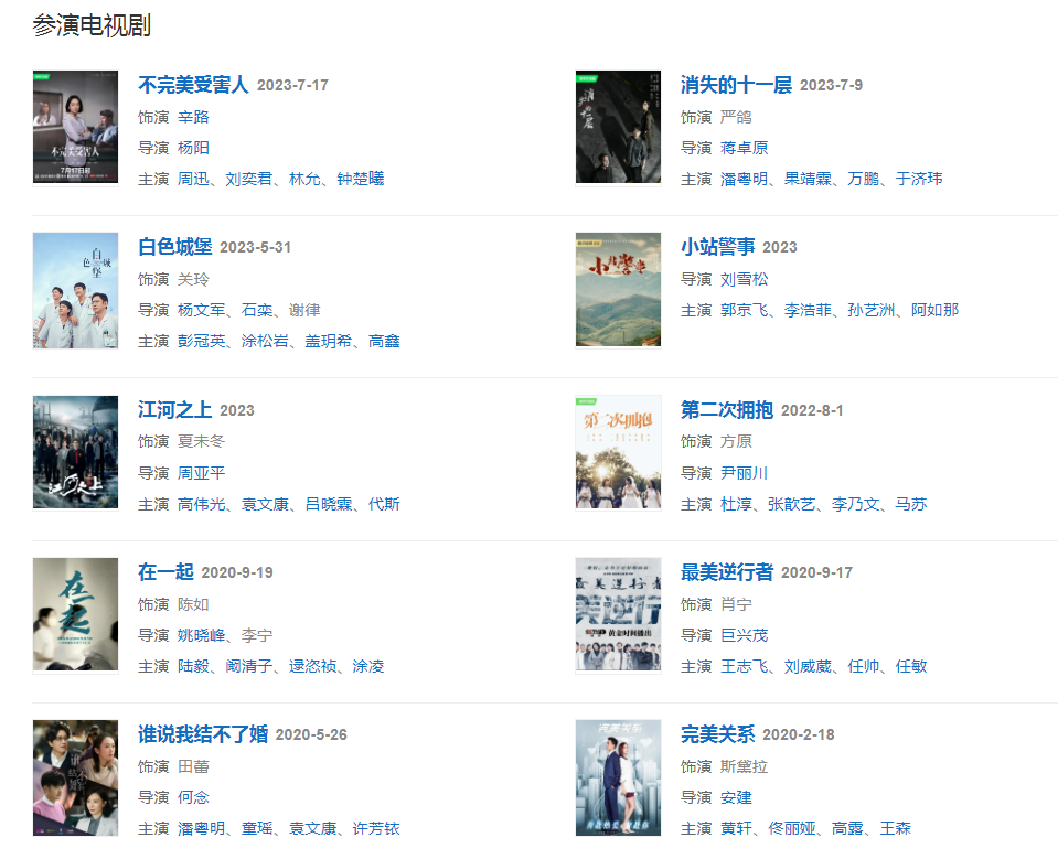 2020218日,出演電視劇《完美關系》;526日主演電視劇《誰說我結不了婚》;917日,出演抗疫題材電視系列劇《最美逆行者》  。