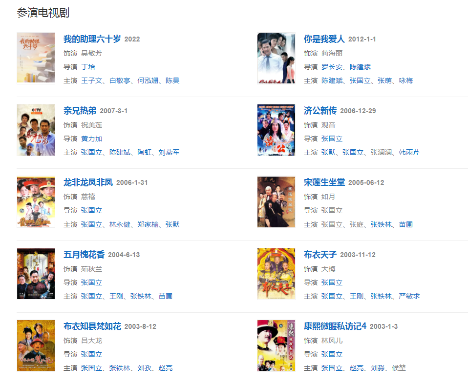 2006年在《親兄熱弟》飾祝美蓮,合作演員有張國(guó)立、陳建斌、陶虹。