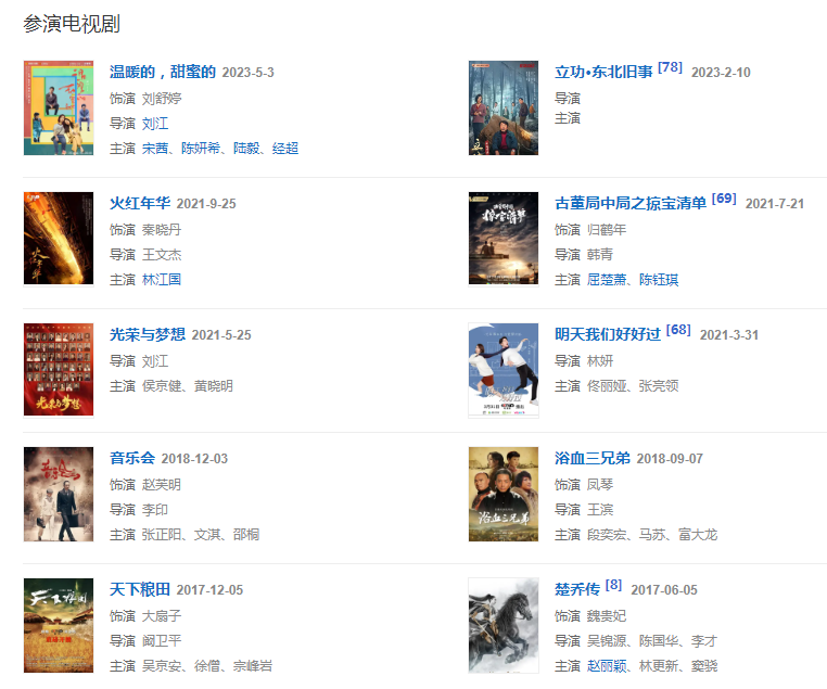 2021525日,出演的重大革命歷史題材劇《光榮與夢想》在北京衛(wèi)視、東方衛(wèi)視及騰訊視頻、愛奇藝、優(yōu)酷同步播出;925日,與林江國主演的工業(yè)史詩劇《火紅年華》在央視一套播出。