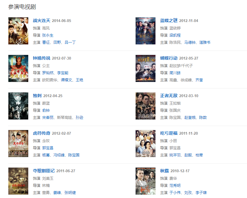 201311月,主演的懸疑劇《藍(lán)蝶之謎》播出。20146月,領(lǐng)銜主演的抗戰(zhàn)劇《戰(zhàn)火連天》播出。