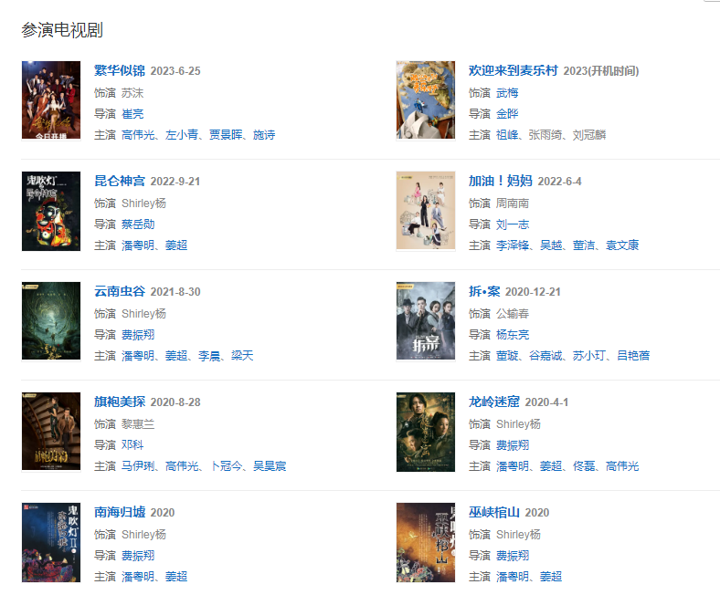 202041日,主演的探險(xiǎn)懸疑劇《龍嶺迷窟》正式開播,劇中飾演Shirley 。612日,參與芒果TV選拔綜藝《乘風(fēng)破浪的姐姐》,最終以第五名的成績(jī)成功成團(tuán)。1030日,參與《乘風(fēng)破浪的姐姐》的成團(tuán)綜藝節(jié)目《姐姐的愛樂之程》。1221日,特別出演的民國(guó)懸疑推理劇《拆·案》在愛奇藝獨(dú)家上線,劇中飾演醫(yī)生公輸春。1231日,隨組合X-SISTER參演湖南衛(wèi)視跨年演唱會(huì),演唱歌曲《無(wú)價(jià)之姐》、《Lady Land》。同年,友情出演電視劇《旗袍美探》,飾演黎惠蘭。