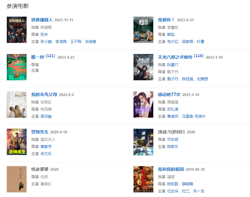 代表作品:長輩、霸王花、血觀音、創(chuàng)世紀、傾世皇妃、心魔、鐵探、不完美的她、僵尸、結婚那件事