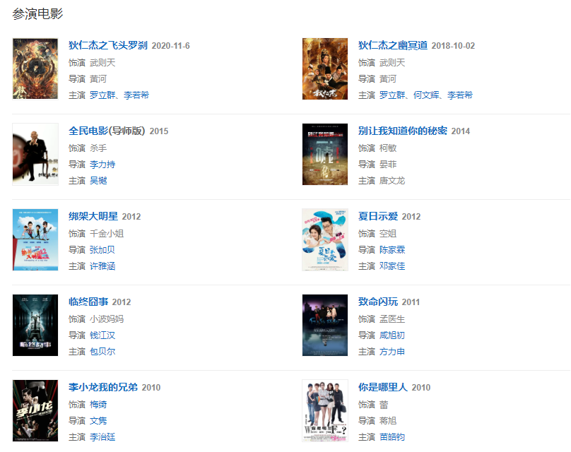 2020116日,特別出演的動作奇幻電影《狄仁杰之飛頭羅剎》在優(yōu)酷上線,在片中飾演女皇武則天。