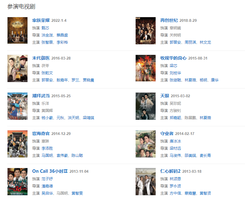 代表作品智勇新警界、宮心計(jì)、溏心風(fēng)暴之家好月圓、On Call 36小時(shí)、名媛望族