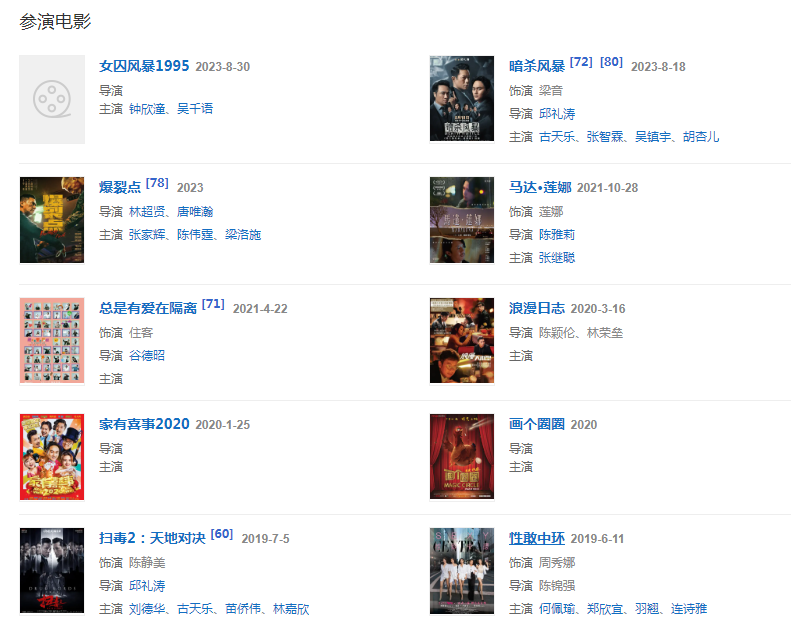 代表作品婚前試愛、唐朝浪漫英雄、非狐外傳、電梯驚魂、葉問外傳:張?zhí)熘?/span>