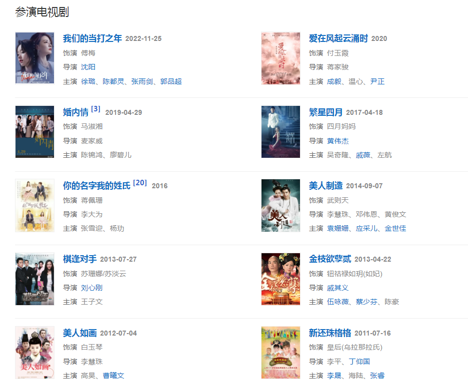 代表作品:《巾幗梟雄》、金枝欲孽、《我和春天有個(gè)約會(huì)》
