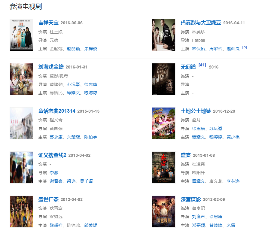2001年,參演喜劇電視劇《皆大歡喜》飾演明朝憲宗皇帝之女。