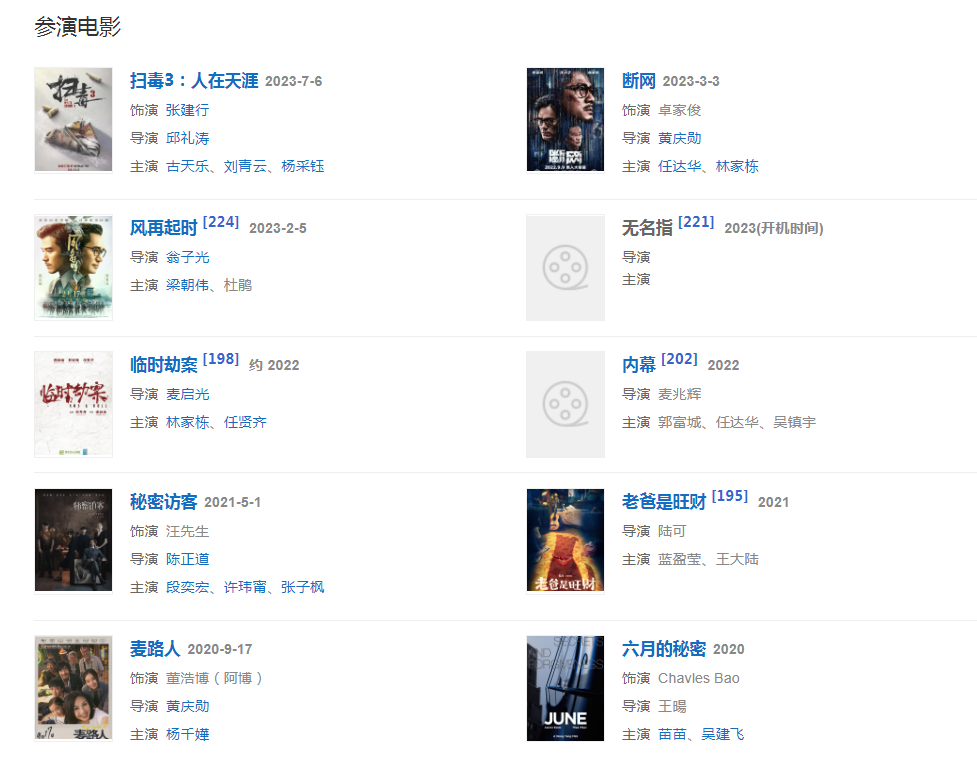 2018年憑借電影《無雙》提名金像獎(jiǎng)最佳男主角  。他主演的電影《風(fēng)云雄霸天下》《寒戰(zhàn)》《寒戰(zhàn)2》三次成為香港年度華語票房冠軍,《寒戰(zhàn)2》刷新香港華語影史票房紀(jì)錄。