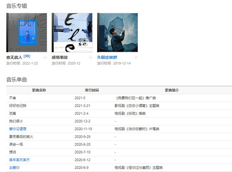 20206月,以唱作人的身份參與愛奇藝唱作人生態(tài)挑戰(zhàn)節(jié)目《我是唱作人第二季》 ;76日,為電視劇《怪你過分美麗》演唱的主題曲《去愛你》正式上線。