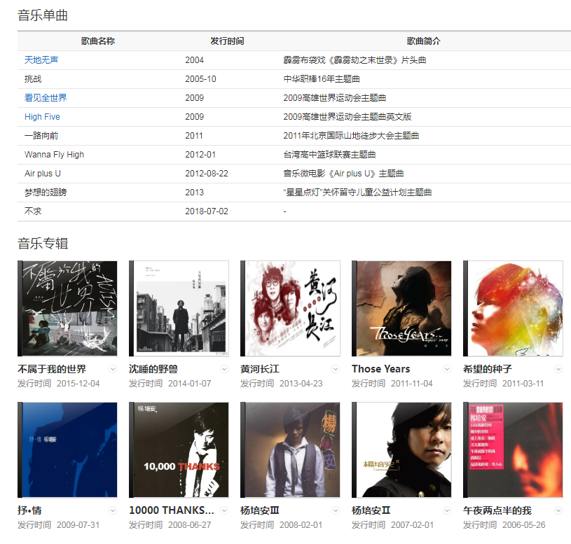 2006526日以“高齡新人”身份推出個(gè)人同名首張專輯《楊培安——午夜兩點(diǎn)半的我》,憑借專輯中的《我相信》一曲打響知名度  。
