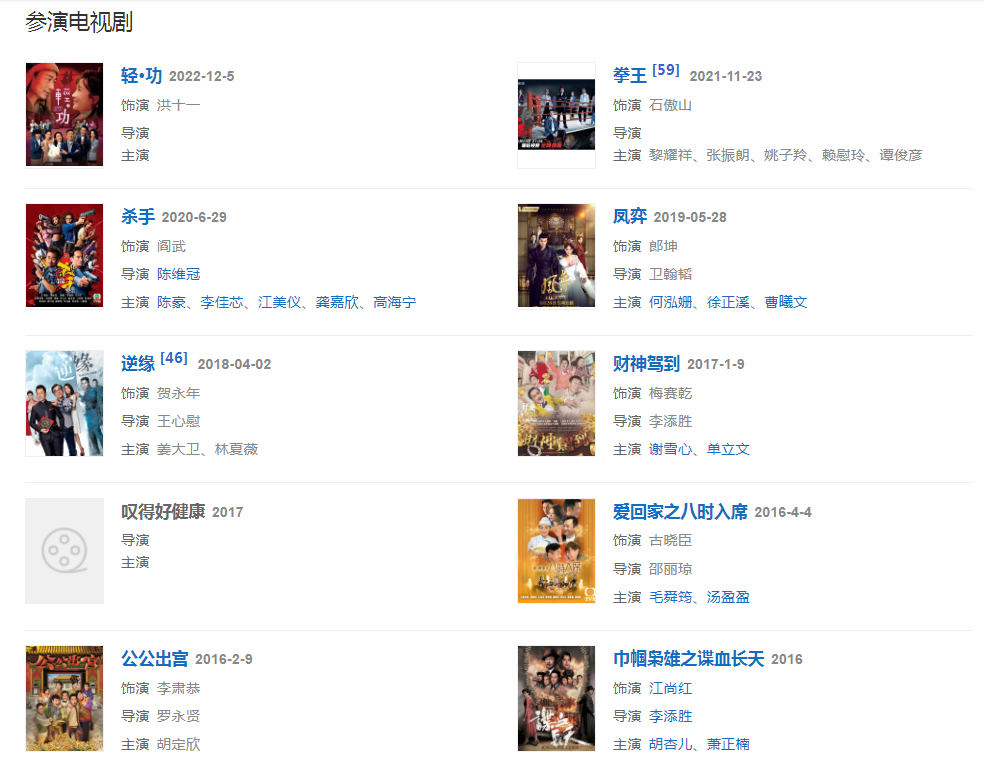 代表作品:西游記、巾幗梟雄、畢打自己人、大太監(jiān)、公公出宮、巾幗梟雄之義海豪情、梟雄